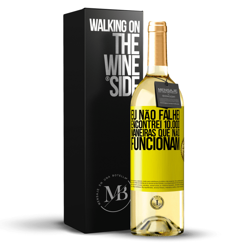 Mensagem em uma Garrafa. Garrafa de vinho com etiqueta personalizada. Mensagem: "Eu não falhei. Encontrei 10.000 maneiras que não funcionam". Etiqueta Amarela. Etiqueta personalizável. |