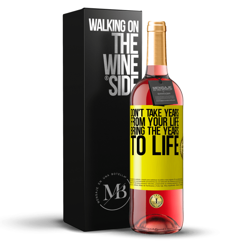 瓶子里的消息. 带有个性化标签的酒瓶. 信息: "不要花几年的时间,而是要把岁月带入生活". 黄色标签. 可自定义的标签. |