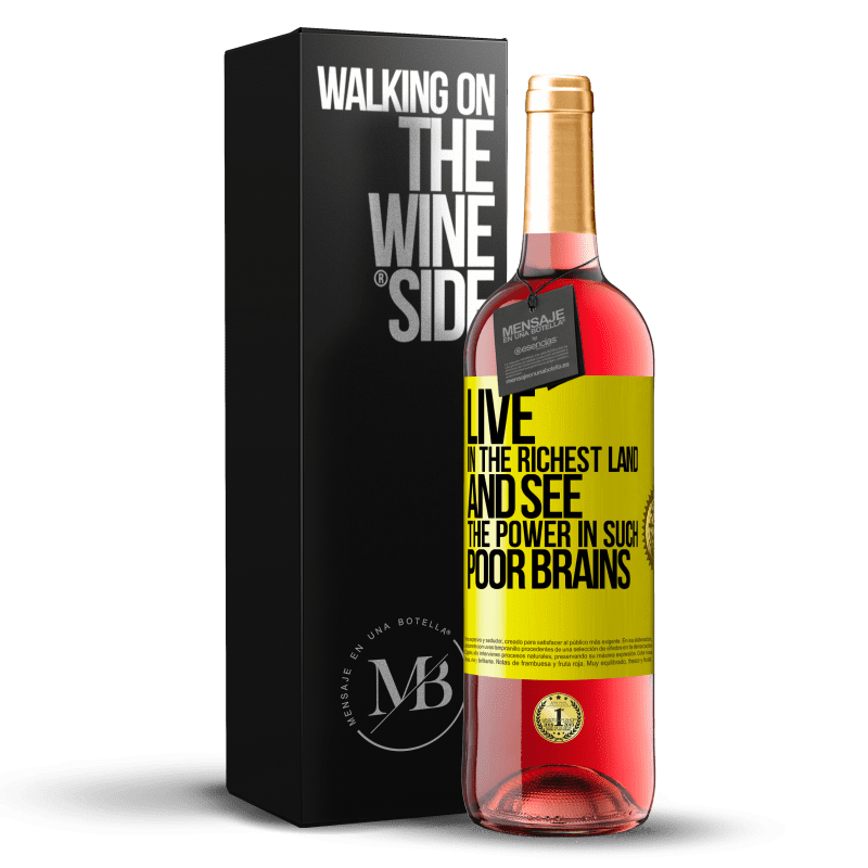 瓶子里的消息. 带有个性化标签的酒瓶. 信息: "生活在最富裕的土地上,在如此贫穷的大脑中看到力量". 黄色标签. 可自定义的标签. |