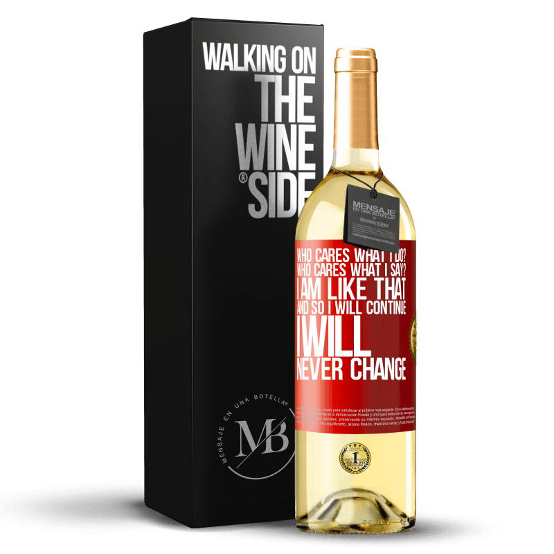 | 名 | 瓶子里的消息. 带有个性化标签的酒瓶. 信息: "谁在乎我做什么?谁在乎我说什么?我就是这样,所以我会继续,我永远不会改变". 红色标签. 可自定义的标签. |