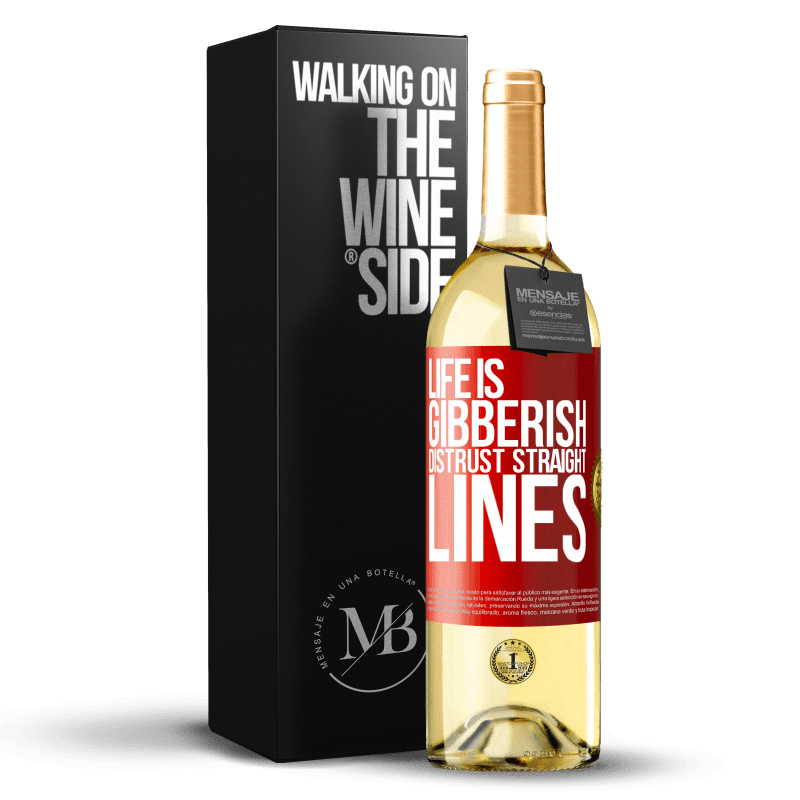瓶子里的消息. 带有个性化标签的酒瓶. 信息: "生活乱七八糟,不信任直线". 红色标签. 可自定义的标签. |