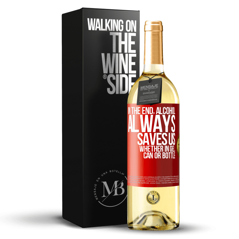 瓶子里的消息. 带有个性化标签的酒瓶. 信息: "最后,无论是凝胶,罐装还是瓶装,酒精总是可以拯救我们". 红色标签. 可自定义的标签. |
