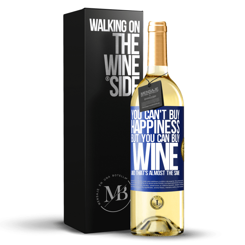 瓶子里的消息. 带有个性化标签的酒瓶. 信息: "你买不到幸福,但你可以买酒,几乎是一样的". 蓝色标签. 可自定义的标签. |