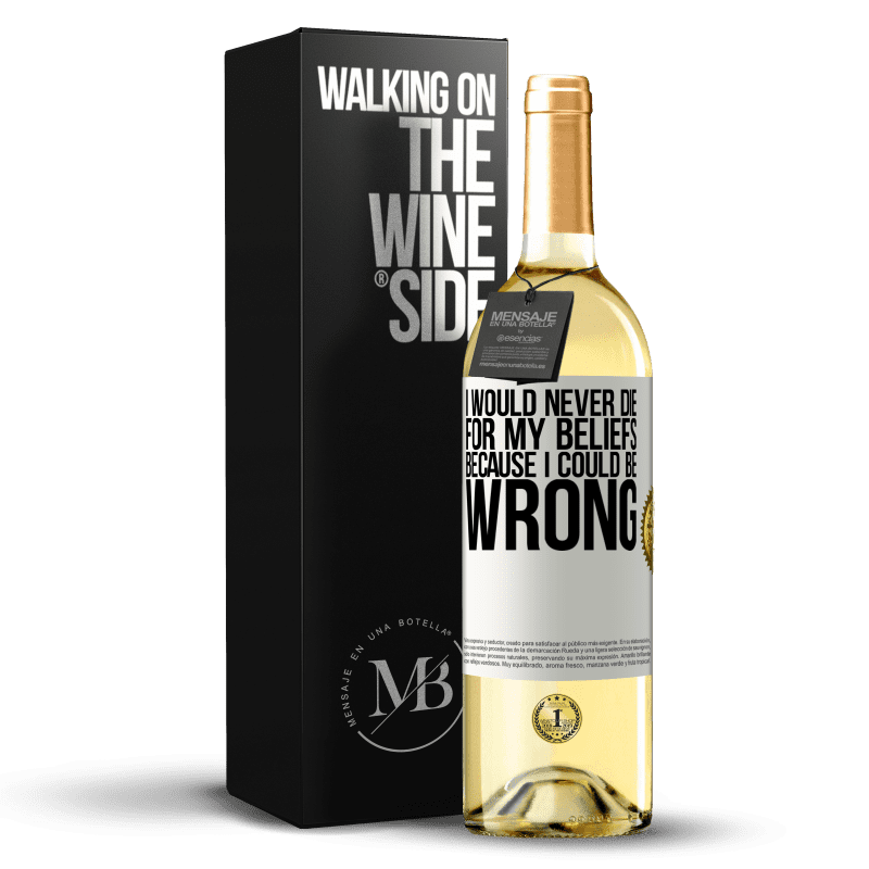 瓶子里的消息. 带有个性化标签的酒瓶. 信息: "我永远不会为自己的信念而死,因为我可能错了". 白标. 可自定义的标签. |