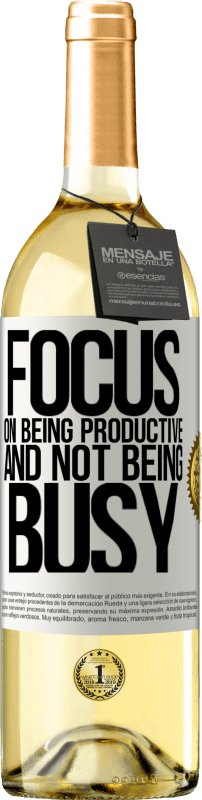 瓶子里的消息. 带有个性化标签的酒瓶. 信息: "专注于生产力和不忙". 白标. 可自定义的标签. |