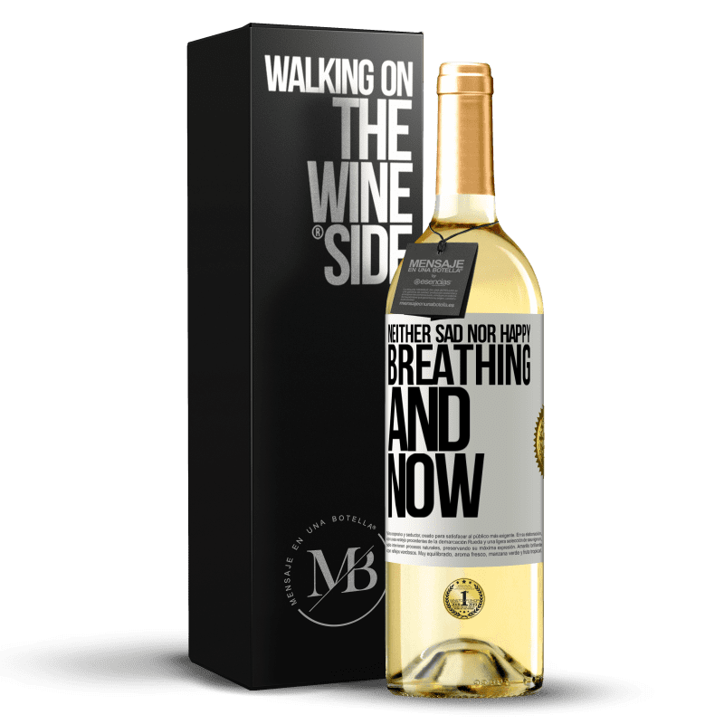 瓶子里的消息. 带有个性化标签的酒瓶. 信息: "既不悲伤也不快乐。现在呼吸". 白标. 可自定义的标签. |