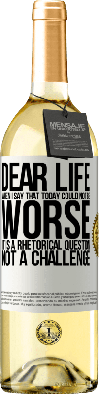 瓶子里的消息. 带有个性化标签的酒瓶. 信息: "亲爱的生命,当我说今天不会更糟时,这是一个反问,不是挑战". 白标. 可自定义的标签. |
