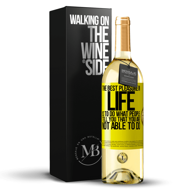 瓶子里的消息. 带有个性化标签的酒瓶. 信息: "生活中最大的乐趣就是做别人告诉你的事情,你做不到". 黄色标签. 可自定义的标签. |