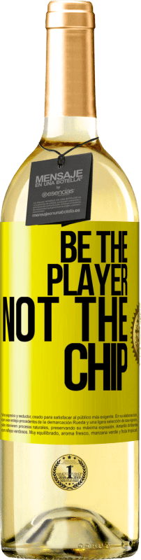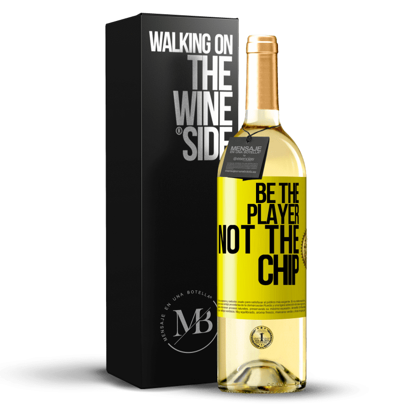 瓶子里的消息. 带有个性化标签的酒瓶. 信息: "成为玩家,而不是筹码". 黄色标签. 可自定义的标签. |