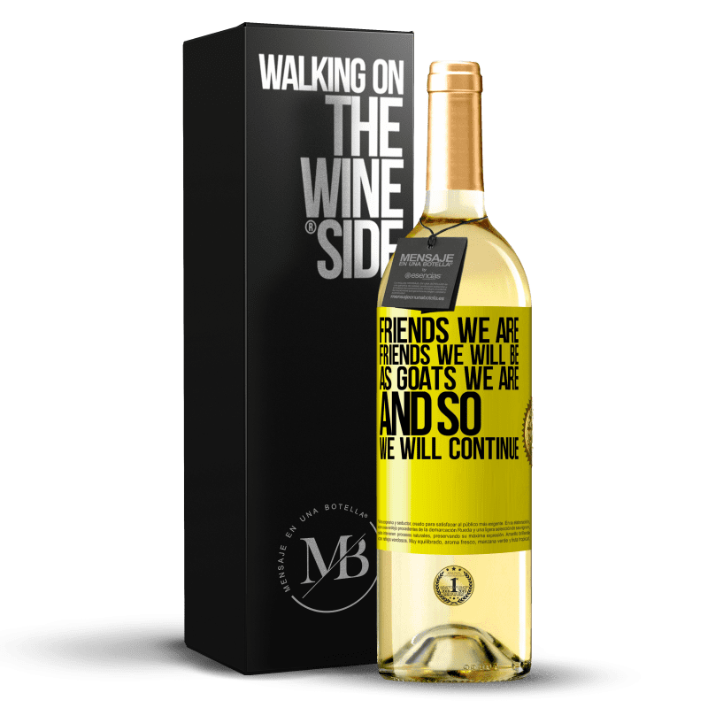 瓶子里的消息. 带有个性化标签的酒瓶. 信息: "我们是朋友,我们将成为朋友,就像山羊一样,所以我们将继续". 黄色标签. 可自定义的标签. |
