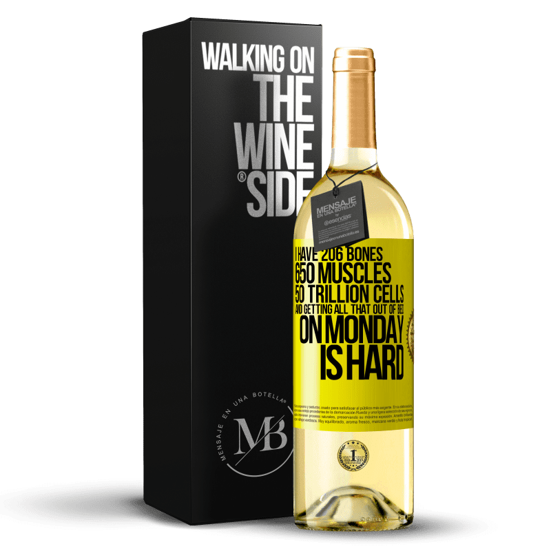瓶子里的消息. 带有个性化标签的酒瓶. 信息: "我有206块骨头,650块肌肉,50万亿个细胞,而星期一很难将所有这些都下床". 黄色标签. 可自定义的标签. |