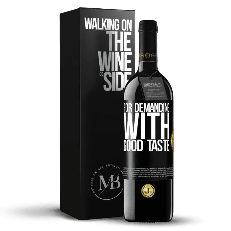 瓶子里的消息. 带有个性化标签的酒瓶. 信息: "要求高,味道好". 黑标. 可自定义的标签. |