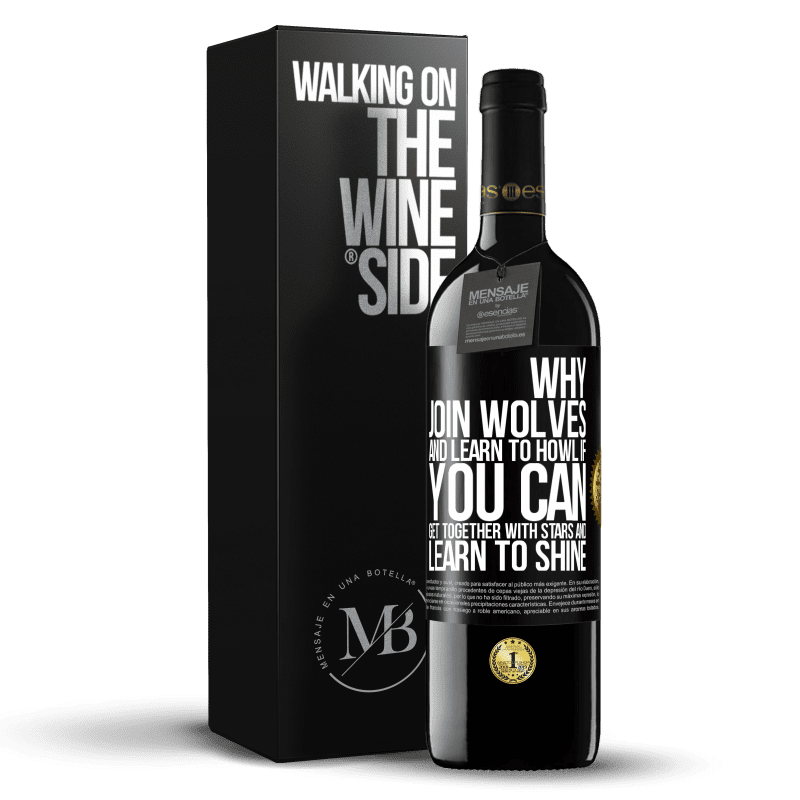 瓶子里的消息. 带有个性化标签的酒瓶. 信息: "如果可以与星星聚在一起并学会发光,为什么要加入狼群并学会to叫呢?". 黑标. 可自定义的标签. |