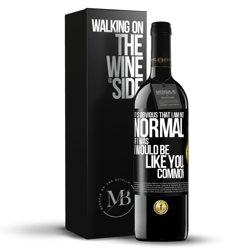 瓶子里的消息. 带有个性化标签的酒瓶. 信息: "很明显,我不正常,如果我是,我会像你一样,普通". 黑标. 可自定义的标签. |