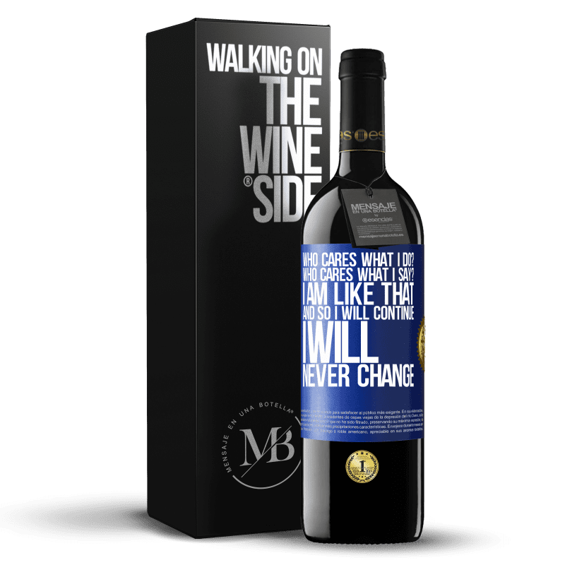 | 名 | 瓶子里的消息. 带有个性化标签的酒瓶. 信息: "谁在乎我做什么?谁在乎我说什么?我就是这样,所以我会继续,我永远不会改变". 蓝色标签. 可自定义的标签. |