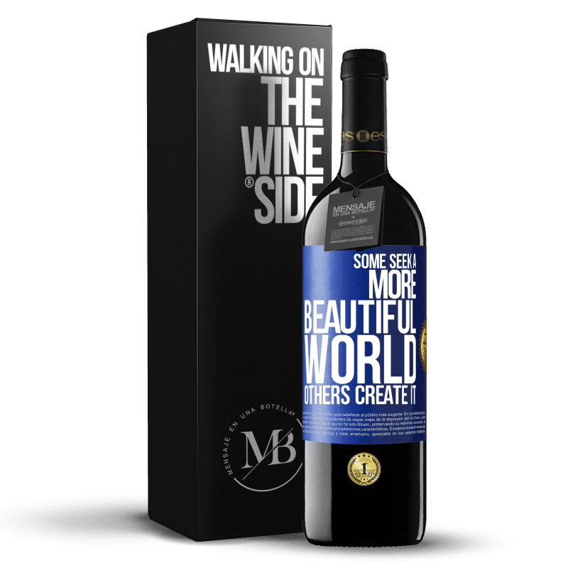 瓶子里的消息. 带有个性化标签的酒瓶. 信息: "有些人寻求更美丽的世界,另一些人创造它". 蓝色标签. 可自定义的标签. |