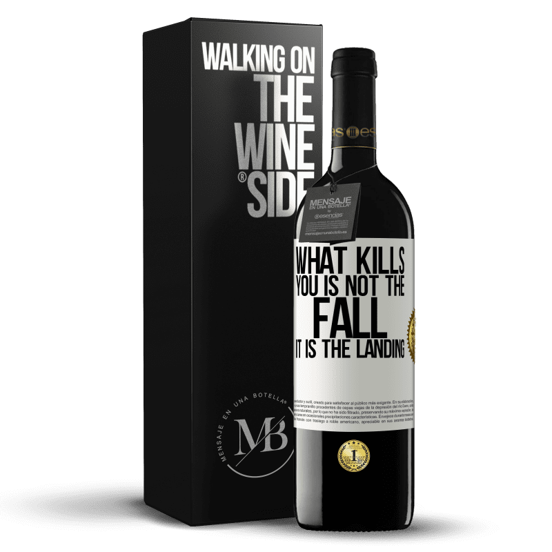 瓶子里的消息. 带有个性化标签的酒瓶. 信息: "杀死你的不是秋天,而是降落". 白标. 可自定义的标签. |