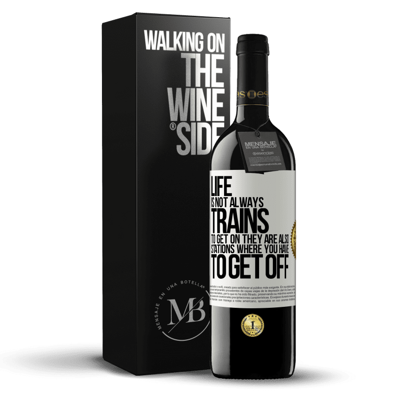 瓶子里的消息. 带有个性化标签的酒瓶. 信息: "生活并不总是火车上车,它们也是您必须下车的车站". 白标. 可自定义的标签. |