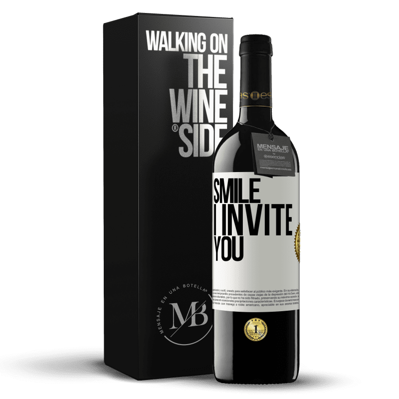 瓶子里的消息. 带有个性化标签的酒瓶. 信息: "微笑,我邀请". 白标. 可自定义的标签. |