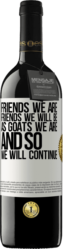 瓶子里的消息. 带有个性化标签的酒瓶. 信息: "我们是朋友,我们将成为朋友,就像山羊一样,所以我们将继续". 白标. 可自定义的标签. |
