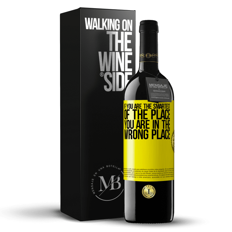 瓶子里的消息. 带有个性化标签的酒瓶. 信息: "如果您是最聪明的地方,那您选错地方了". 黄色标签. 可自定义的标签. |