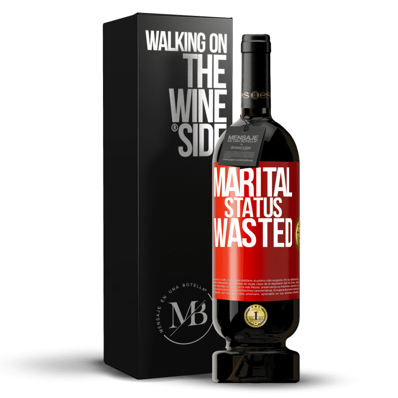 瓶子里的消息. 带有个性化标签的酒瓶. 信息: "婚姻状况:浪费". 红色标签. 可自定义的标签. |