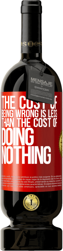 瓶子里的消息. 带有个性化标签的酒瓶. 信息: "错误的代价小于无所作为的代价". 红色标签. 可自定义的标签. |