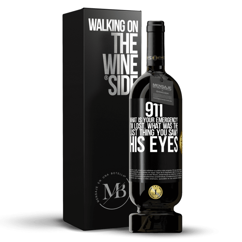 瓶子里的消息. 带有个性化标签的酒瓶. 信息: "911,您的紧急情况是什么?我迷路了您最后看到的是什么?他的眼睛". 黑标. 可自定义的标签. |