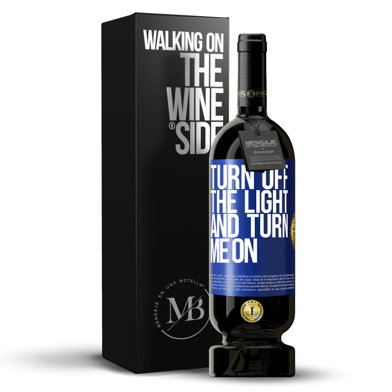 瓶子里的消息. 带有个性化标签的酒瓶. 信息: "关掉灯然后打开我". 蓝色标签. 可自定义的标签. |