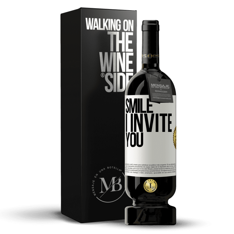 瓶子里的消息. 带有个性化标签的酒瓶. 信息: "微笑,我邀请". 白标. 可自定义的标签. |