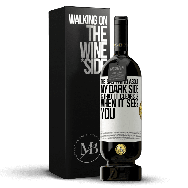 瓶子里的消息. 带有个性化标签的酒瓶. 信息: "关于我的阴暗面的坏事是,当看到你时它就会消失". 白标. 可自定义的标签. |