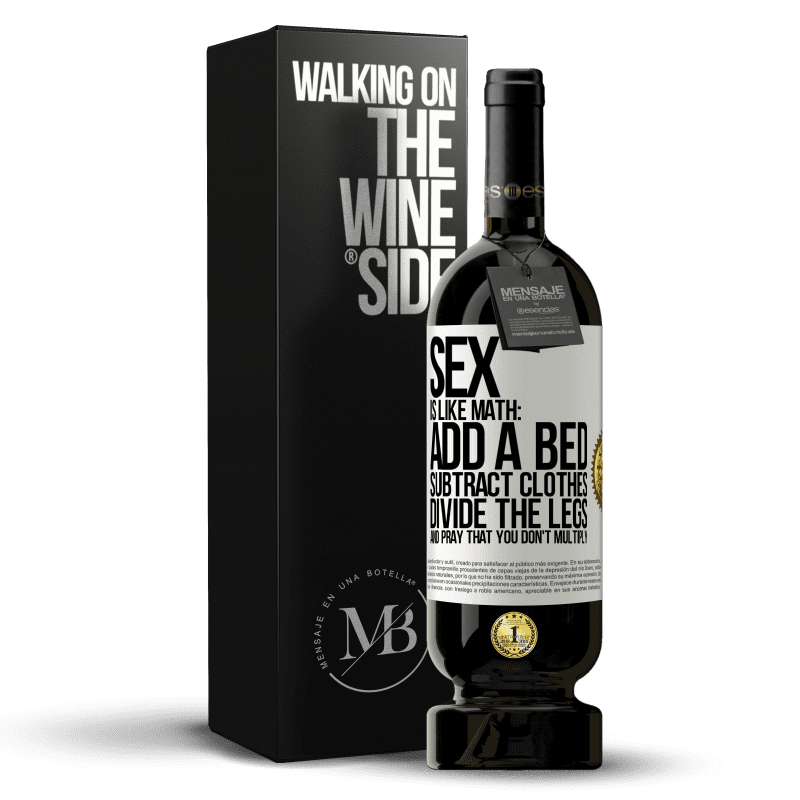 瓶子里的消息. 带有个性化标签的酒瓶. 信息: "做爱就像数学:加床,减少衣服,分开腿,祈祷不要繁殖". 白标. 可自定义的标签. |
