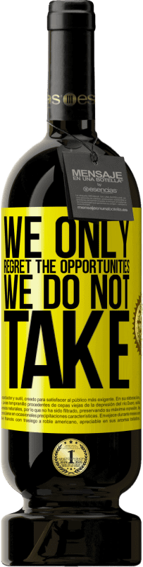瓶子里的消息. 带有个性化标签的酒瓶. 信息: "我们只为我们没有抓住机会感到遗憾". 黄色标签. 可自定义的标签. |