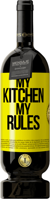 瓶子里的消息. 带有个性化标签的酒瓶. 信息: "我的厨房,我的规则". 黄色标签. 可自定义的标签. |